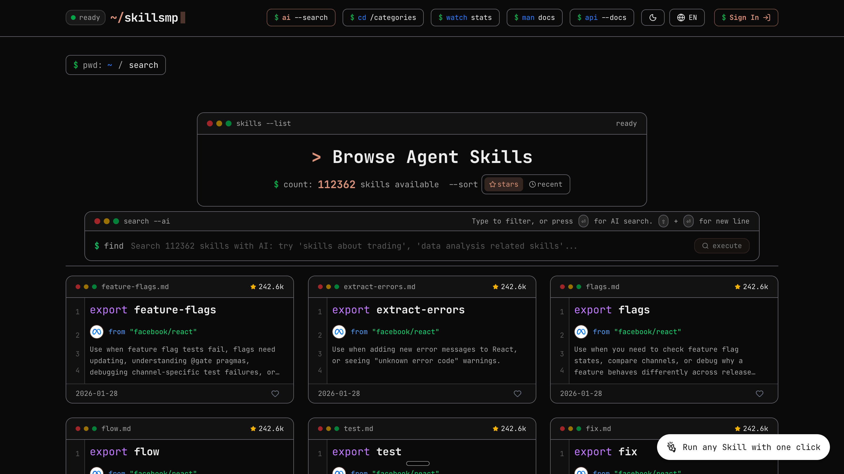 Finding the right agent skill among thousands of GitHub repositories is overwhelming. SkillsMP solves this by aggregating everything into one searchable place. The platform indexes 87K+ skills that follow the open SKILL.md standard (released by Anthropic in December 2025, adopted by OpenAI for Codex CLI). Smart search, category filtering, quality indicators. Skills are pulled directly from public GitHub repos, filtered for a minimum of 2 stars, and regularly synced. An independent community project, not affiliated with Anthropic. Started as a Reddit thread, grew into the go-to discovery layer for anyone extending Claude Code, Codex, or similar AI coding assistants.